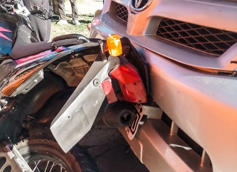 En su intento de fuga, perdió el control del rodado y colisionó contra el portón de un garaje y una camioneta estacionada sobre la trotadora, provocando daños materiales.